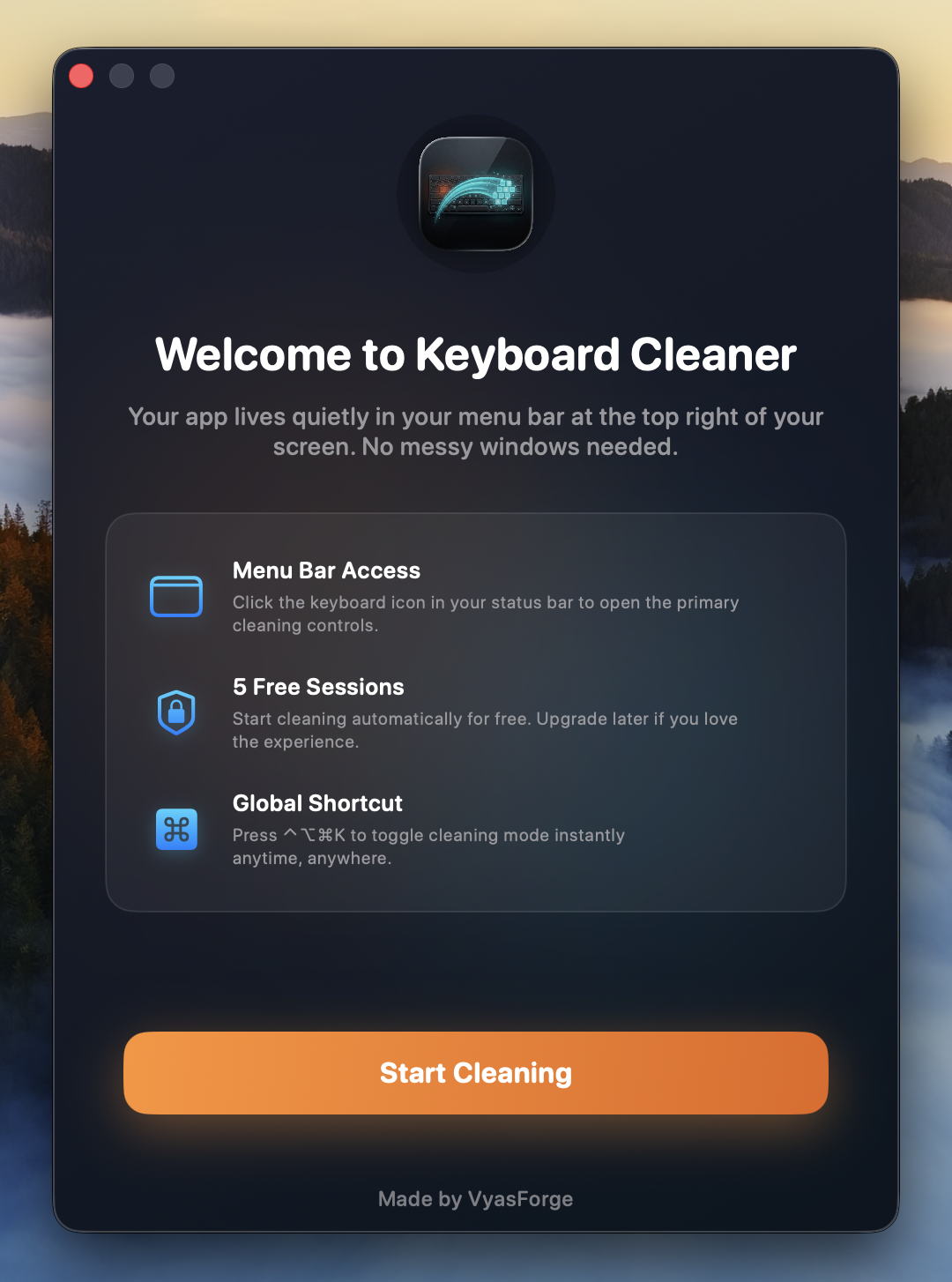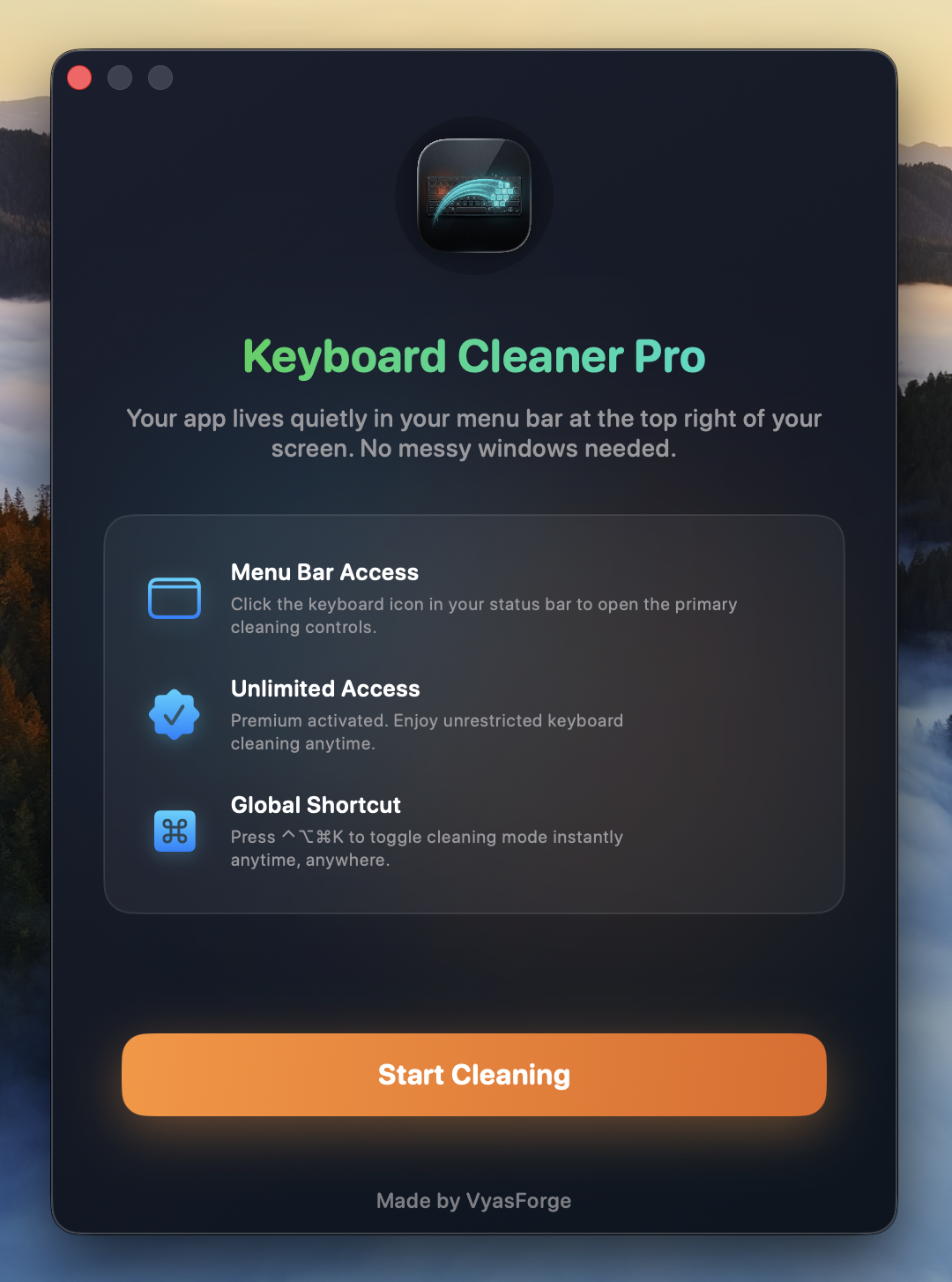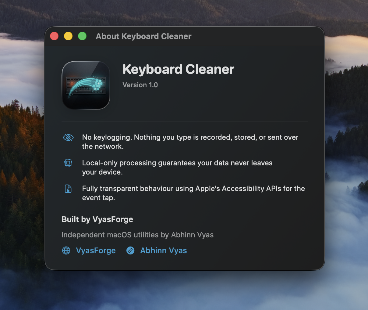 No keylogging, ever. Keyboard Cleaner is a local-only utility. Nothing you type is recorded, stored, or sent over the network. It uses Apple's Accessibility APIs purely to intercept keyboard events during cleaning mode.